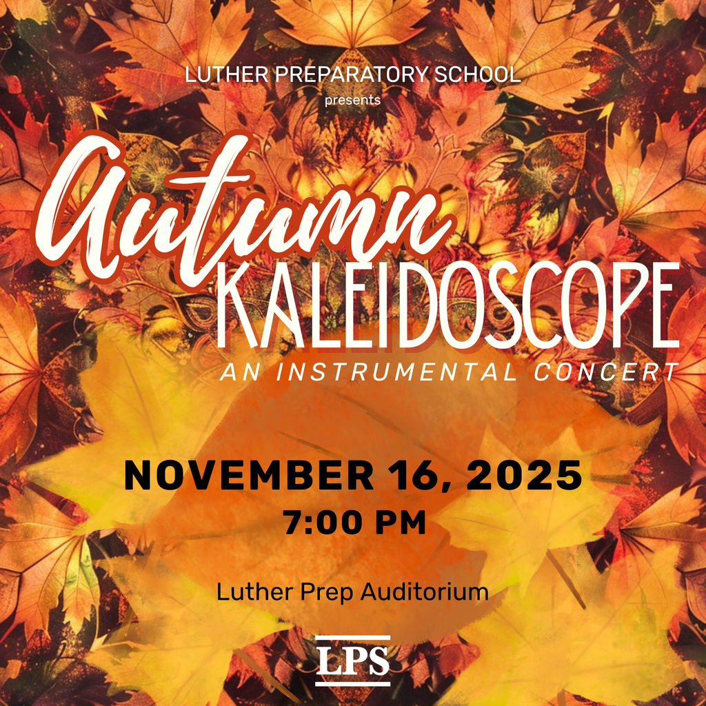 On Sunday, November 16, the music department of Luther Preparatory School will be presenting its annual fall instrumental concert. This year's concert is entitled "Autumn Kaleidoscope," and the program will include a wide variety of selections presented by our various student instrumental ensembles. The concert will be held in the LPS Auditorium, beginning at 7:00 PM. We hope you can join us for a wonderful evening of music!