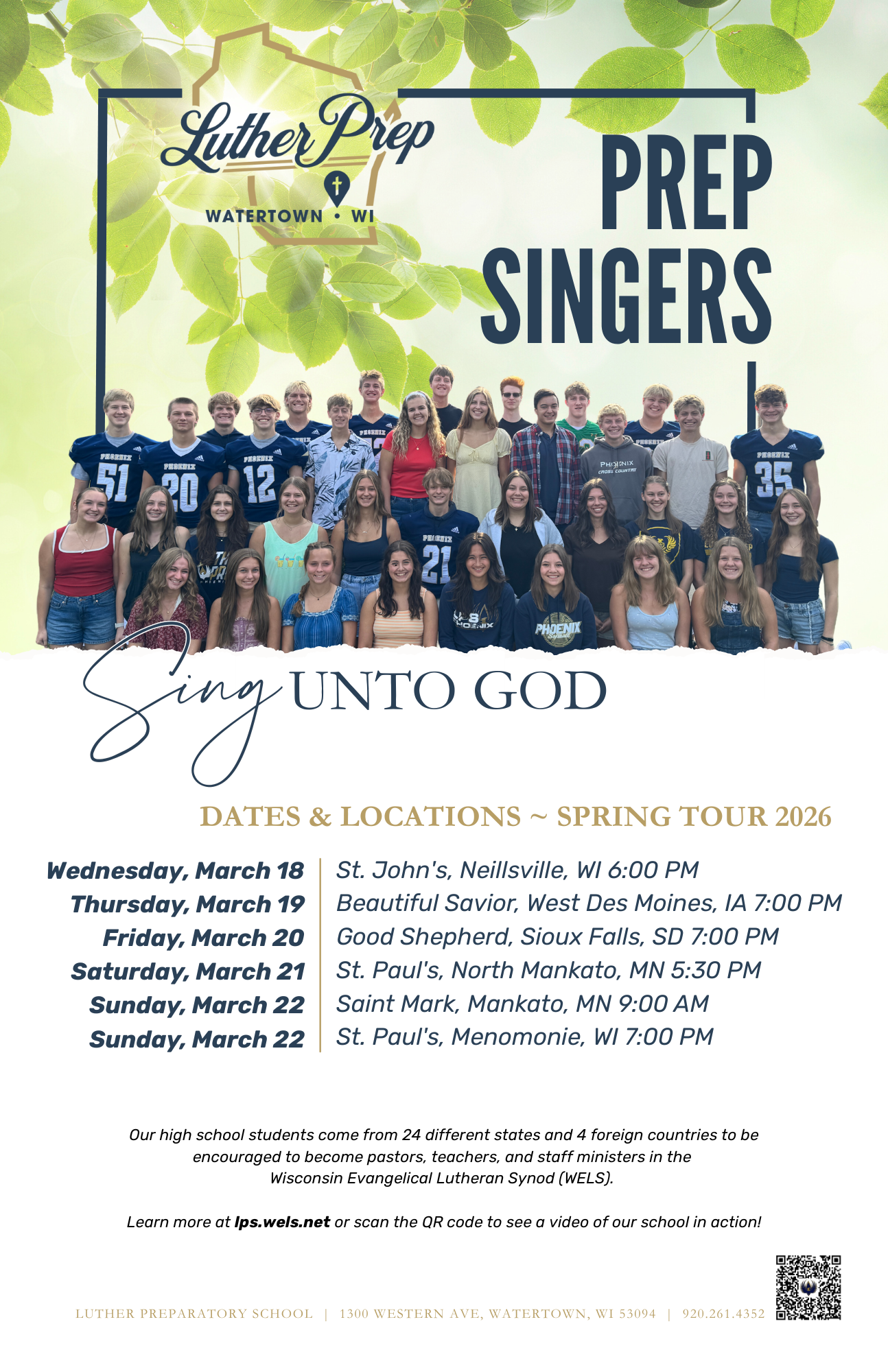 The Prep Singers are the singing ambassadors of Luther Preparatory School. This elite group of singers participates in congregational services on the weekends around Wisconsin and Illinois. They also take an extended spring choir tour to congregations around the country. The choir participates in a Choral Fest along with special engagements for church groups. Participation in this choir is by audition only.