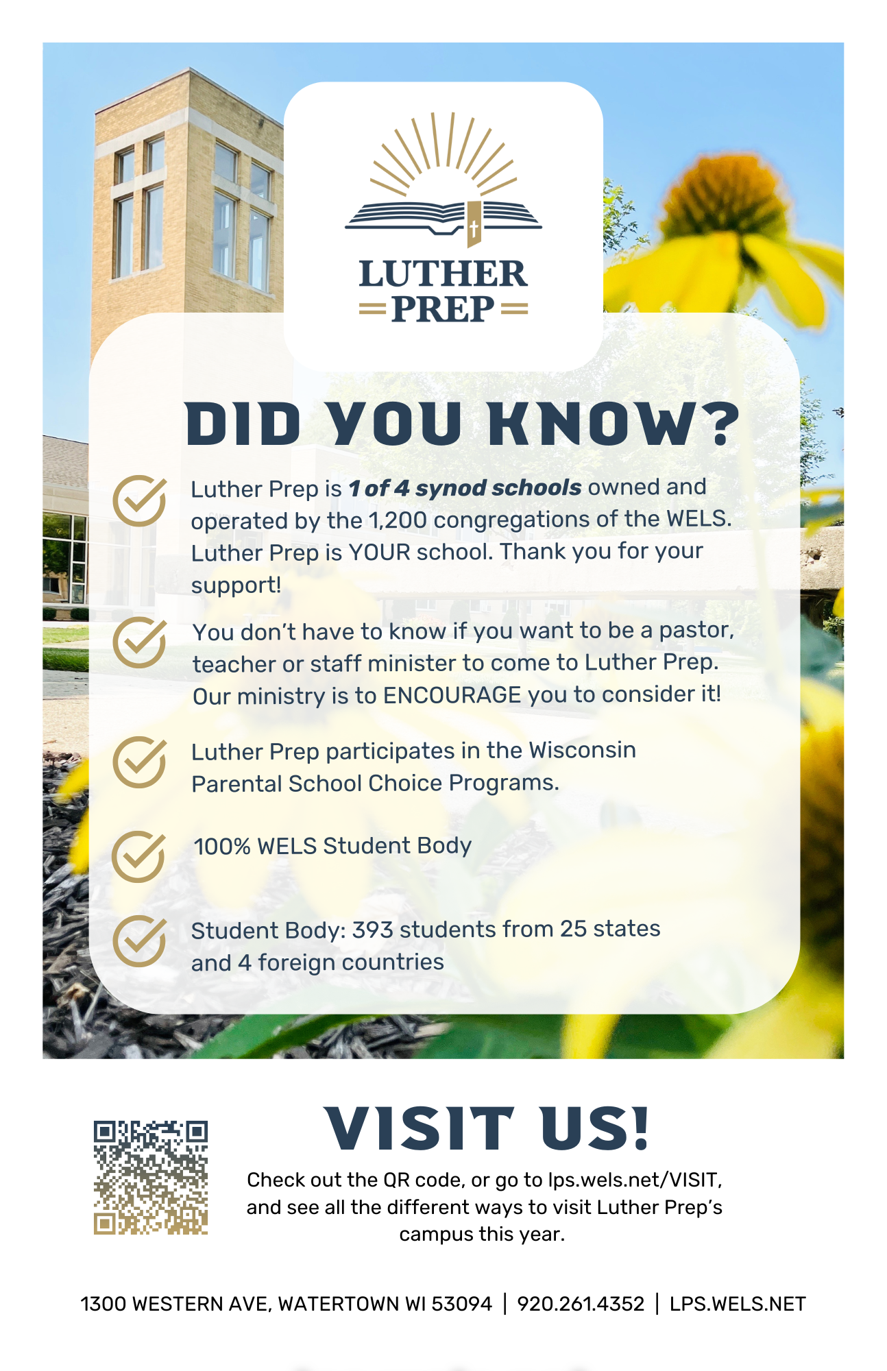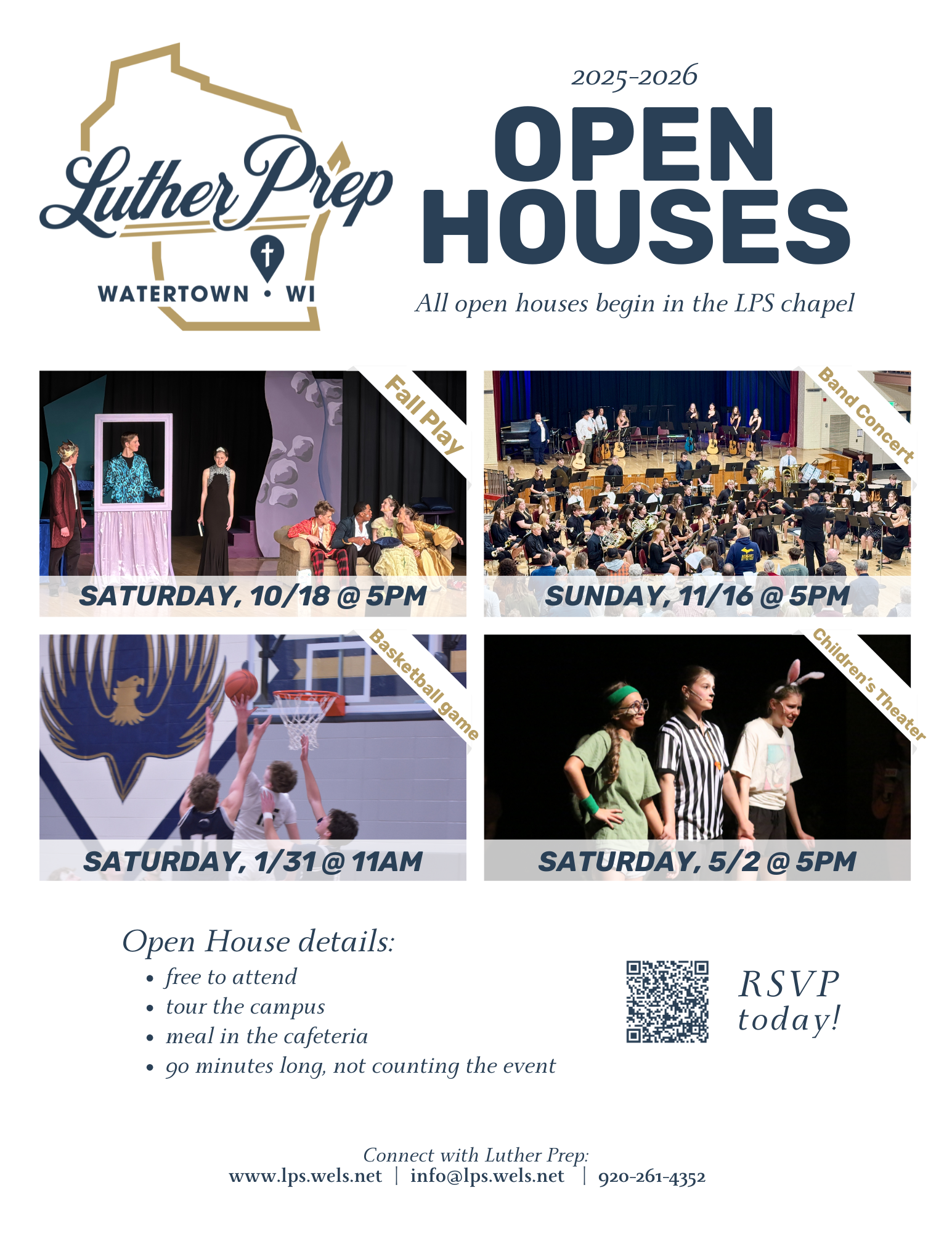 OPEN HOUSES - Luther Prep has multiple ways to visit campus! Join us for an Open House Dates: 10/18 @ 5pm, 11/16 @ 5pm, 1/31 @ 11am & 5/2 @ 5pm